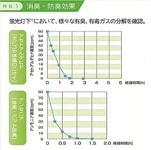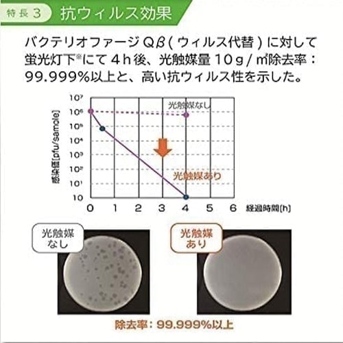 - 酸化タングステンという光触媒が可視光(LEDライトも含む)との作用により、消臭・抗菌・抗ウイルス効果を発揮します。